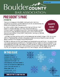THE BCBA NEWSLETTER IS A MONTHLY ELECTRONIC PUBLICATION BY THE BOULDER COUNTY BAR ASSOCIATION. ARTICLES BY GUEST LAWYERS MAY NOT BE REPRODUCED WITHOUT PERMISSION FROM THE BOULDER COUNTY BAR ASSOCIATION OR THE AUTHORS. COMMERCIAL ADVERTISING INFORMATION IS AVAILABLE BY CONTACTING bay@boulder-bar.org OR THE BAR'S WEBSITE www.boulder-bar.org