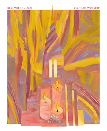 PRELUDE: Meditation on “Divinum Mysterium” — Charls Callahan “O Come, O Come Emmanuel” — arr. Marshall McDonald/Steven Nelson with Brian Donat, Cello INTROIT Let me enter God’s own dwelling, open wide the lovely door! Here, all earthly powers excelling, God receives the sick and poor. Joy, my heart, in this dear place: here I see God face to face. (Words: Benjamin Scholck, tr. Madeleine Marshall; Tune: Unser Herrscher, Joachim Neander) *PROCESSIONAL HYMN: #192 “There's a Spirit in the Air” LIGHTING THE ADVENT CANDLES Joy: The Song of New Creation Mary Steensma & Jim Leunk Each week in Advent, we light candles on the wreath as a sign of the growing light of Christ in the world. The circle of evergreen reminds us that God’s love has no end, and the candles mark our journey from darkness toward the dawn of new creation. As the flame is shared, we remember that God’s promise is unfolding still—hope, peace, joy, and love taking root in us and among us, until the light of Christ leads us to new life. READING FROM THE PROPHETS: Isaiah 35:1–10 (New Revised Standard Version, Updated) The wilderness and the dry land shall be glad; the desert shall rejoice and blossom; like the crocus it shall blossom abundantly and rejoice with joy and shouting. The glory of Lebanon shall be given to it, the majesty of Carmel and Sharon. They shall see the glory of the Lord, the majesty of our God. Strengthen the weak hands and make firm the feeble knees. Say to those who are of a fearful heart, “Be strong, do not fear! Here is your God. God will come with vengeance, with terrible recompense. God will come and save you.” Then the eyes of the blind shall be opened, and the ears of the deaf shall be opened; then the lame shall leap like a deer, and the tongue of the speechless sing for joy. For waters shall break forth in the wilderness and streams in the desert; the burning sand shall become a pool and the thirsty ground springs of water; the haunt of jackals shall become a swamp; the grass shall become reeds and rushes. A highway shall be there, and it shall be called the Holy Way; the unclean shall not travel on it, but it shall be for God’s people; no traveler, not even fools, shall go astray. No lion shall be there, nor shall any ravenous beast come up on it; they shall not be found there, but the redeemed shall walk there. And the ransomed of the Lord shall return and come to Zion with singing; everlasting joy shall be upon their heads; they shall obtain joy and gladness, and sorrow and sighing shall flee away. RESPONSE (as the candles are lit) We light this third candle as a sign of joy. The wilderness and the dry land shall be glad; the desert shall rejoice and blossom. Waters will break forth in the wilderness, and streams in the desert. In God’s new creation, sorrow and sighing will flee away. Joy blossoms where light touches the soil—new life emerging from God’s grace. Come, people of promise, and rejoice! Come, Lord Jesus—make all things new. *SONG: "Arise, Shine", sung twice *WELCOME *GATHERING HYMN: #182 “Word of God, Come Down on Earth”, vv 1, 3 WELCOMING NEW MEMBERS Thomas Beach Melissa Boyack Michael Boyack Robert James Coatsworth Mary Rebecca Fetterman *CONGREGATIONAL PLEDGE Members of the family of God, I commend to you these persons. Do all in your power to increase their faith, confirm their hope and perfect them in love. We give thanks for the faith God has worked within you. We pledge to you our Christian love and hospitality as those who also live by hope. Together with you and all Christians this day, we seek the unity of the Spirit in the bond of peace, that in everything God may be glorified through Jesus Christ. *HYMN: #557 "Blest Be the Tie that Binds", v. 1 Blest be the tie that binds our hearts in Christian love; the fellowship of kindred minds is like to that above. SCRIPTURE: James 5:7–10 (New Revised Standard Version, Updated) Be patient, therefore, siblings, until the coming of the Lord. The farmer waits for the precious crop from the earth, being patient with it until it receives the early and the late rains. You also must be patient. Strengthen your hearts, for the coming of the Lord is near. Siblings, do not grumble against one another, so that you may not be judged. See, the Judge is standing at the doors! As an example of suffering and patience, siblings, take the prophets who spoke in the name of the Lord. For the Word of God in Scripture. For the Word of God among us. For the Word of God within us. Thanks be to God. ANTHEM: Brenda Nitsch and Juli Elliot, soloists Recitative and Aria: "He shall feed his flock”, from Messiah — G. F. Handel Recitative: Then shall the eyes of the blind be open’d, and the ears of the deaf unstopped; then shall the lame man leap as an hart, and the tongue of the dumb shall sing. Aria: He shall feed his flock like a shepherd: he shall gather the lambs with his arm, and carry them in his bosom, and shall gently lead those that are with young. Come unto me, all ye that labor and are heavy laden, and I will give you rest. Take my yoke upon you, and learn of me; for I am meek and lowly in heart: and ye shall find rest unto your souls. CHILDREN'S TIME: Children of all ages are invited to join us in this special moment. LORD’S PRAYER Our Father (or Our God), who art in heaven, hallowed be Thy name. Thy kingdom come, Thy will be done on earth as it is in heaven. Give us this day our daily bread. And forgive us our trespasses, as we forgive those who trespass against us. And lead us not into temptation, but deliver us from evil. For Thine is the kingdom, and the power, and the glory, forever. Amen. *HYMN: #210 “All Earth is Waiting” SERMON CALL TO PRAYER “Come unto me, ye weary, and I will give you rest.” O blessed voice of Jesus, which comes to hearts oppressed! It tells of benediction, of comfort, grace, and peace, of joy which has no ending, of love which cannot cease. (Words: W. Chatterton D