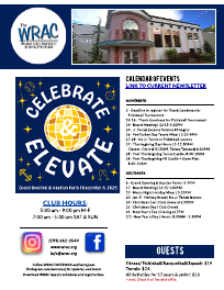 calendar of events LINK TO CURRENT NEWSLETTER NOVEMBER 5 - Deadline to register for Thank Goodness for Pickleball Tournament 14-16 - Thank Goodness for Pickleball Tournament 19 - Board Meeting | 12:15-1:30PM 24 - Jr. Tennis Lessons Session #4 begins 26 - Pre-Turkey Day Tennis Mixer | 5:30-9PM 27-28 - No Jr. Tennis or Pickleball Lessons 27 - Thanksgiving Day Hours | 5-11:30AM Classes: Cycle @ 5:15AM, Turkey Tabata @ 8:30AM 28 - Post Thanksgiving Tennis Cardio, 8:30-10AM 28 - Post Thanksgiving PB Cardio + Open Play, 8:30-10AM DECEMBER 6 - Grand Opening & Auction Party | 5-7PM 17 - Board Meeting |12:15-1:30PM 17 - Men’s Night Holiday Mixer | 5:30PM 20- Jan. 5 - Holiday Break | No Jr. Tennis lessons 24 - Christmas Eve | Club closes at 2:30PM 25 - Christmas Day | Club Closed 31 - New Year’s Eve | Closing at 7PM 1/1- New Year’s Day | Hours: 8:30AM - 5:30PM