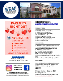 calendar of events LINK TO CURRENT NEWSLETTER FEBRUARY EVENTS: ALL MONTH - Feb. Check-In Challenge 4 - 30DAY Fitness Challenge Ends 5 - Jr. Tennis & Pickleball Lessons start 6-8 - CHILLY DOG Tennis Tournament 13 - Parent's Night Out | 5:30-8PM 13 - Galentine's SHiNE Dance Class | 6-7PM 18 - Board Meeting / 12:15-1:30PM 27-Mar. 1 - HS Tennis Camp MARCH EVENTS: 2 - High School Tennis Team begins outdoor court use for practices, weekdays 3:30-5:30PM and some Saturdays. See WRAC Google calendar for dates. 4 - 30DAY Fitness Challenge Ends 5 - Jr. Tennis & Pickleball Lessons start 6-8 - CHILLY DOG Tennis Tournament 18 - Board Meeting / 12:15-1:30PM 18 - Summer Camp and Group Swim sign ups | Members Only 25 - Summer Camp and Group Swim sign ups | Public APRIL EVENTS: 14-16 - AWESOME BLOSSOM Pickleball Tournament 15 - Private Swim Lesson sign ups | Members Only 22 - Private Swim Lesson sign ups | Public