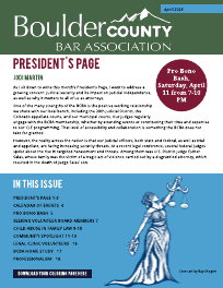 THE BCBA NEWSLETTER IS A MONTHLY ELECTRONIC PUBLICATION BY THE BOULDER COUNTY BAR ASSOCIATION. ARTICLES BY GUEST LAWYERS MAY NOT BE REPRODUCED WITHOUT PERMISSION FROM THE BOULDER COUNTY BAR ASSOCIATION OR THE AUTHORS. COMMERCIAL ADVERTISING INFORMATION IS AVAILABLE BY CONTACTING bay@boulder-bar.org OR THE BAR'S WEBSITE www.boulder-bar.org