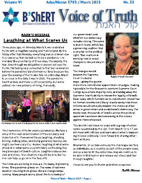 RABBI'S MESSAGE Laughing at What Scares Us Three years ago, on Monday March 9, we celebrated Purim with a megillah reading and Purimshpiel. By the Friday after that Monday, everything had shut down due to a new virus that turned out to be a pandemic. I remember the uncertainty of those days, the anxiety, the fear. Even though we did gather in person last year for Purim, I’m feeling very connected to that last celebration before the pandemic transformed our lives because this year the evening of Purim also falls on a Monday, March 6, so close to the date it was in 2020. The pandemic hasn’t ended, and there is still uncertainty, but we’ve settled into new patterns of living, if uneasily. The irreverence of Purim seems paradoxical. We take a story of the near-extermination of Persian Jewry and make fun of it. If we weren’t busy laughing, shouting, booing, making jokes, and being generally raucous, we might see how scary it is. Humor, laughing at what we’re afraid of or what we’re uncomfortable confronting, has long been part of Jewish culture. Laughter reduces tension and stress. Our situation may still be dire, but humor can help us go on in the face of it. The times we are living in now are, for many, frightening times. The pandemic grinds on. The news of extreme weather resulting from global climate change keeps coming. Many people worry about the functioning of our government and whether our democracy remains strong. The same is true in Israel, which has a governing coalition that is very far to the political right. That coalition is working now to enact changes to the judiciary in Israel. The changes would weaken the Supreme Court in several ways—giving the government more control over appointment of judges, making it possible for the Knesset to overturn Supreme Court rulings by a simple majority vote, and taking away the Supreme Court’s ability to review the legality of Israel’s Basic Laws, which function as its constitution. (Israel has no formal constitution.) Many Israelis worry that these reforms would seriously weaken the checks and balances in government and erode Israel’s democracy. For weeks now, thousands of Israelis across the political spectrum have been demonstrating in the streets against these proposals. This month I will travel to Israel with a group of senior rabbis assembled by the UJA. From March 12 to 17, we will meet with officials and learn about what is happening in Israel politically. I look forward to sharing what I learn with you. Meanwhile, let us take seriously the challenges we face as individuals, as a country, as part of the people Israel, and as a world. At the same time, may we continue to be able to find humor and release our stress and fear through laughter. I hope to see you for Purim and other occasions! Rabbi Hoover