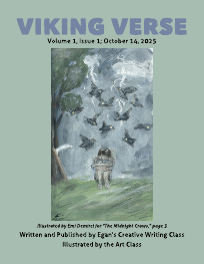 "The Midnight Crows" by Anahi Hottegindre Lebegue "Memories" by Nikki Yordanova "Competition" by Yiming Sun "Fearful Forest" by Kyan Sheth "Confusion" by Yousuf Elmalk "The Locker" by Maya Stern "The Dead of Night" by Ella Goldberg "Winter" by Henry Themaat "The Echoes I Can't Hear" by Stephanie Hsieh "Snowflake" by Coraline Heise "Betrayal" by Annabelle Witteles "Skiing" Theo Zhang "Sunset" by Mika Markovich "Wonder" by Avy Vinodkumar "Heatwave" by Macie Northam Schulze "An Ominous Place" by Dylan O'Brien "Hands of Friendship" by Ziya Charaniya "Survival" by Gyan Guthula "Cold" by Amar Ahuja "The Hike" by Vera Skachkova "Lucky Cherries" by Ari Eagleman "Pastels" by Rita Northam Schulze