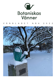 Höstdagarna kan verkligen vara fina att uppleva i Botaniska och skulle vi få snö denna vinter så är det också underbart att vandra runt i denna oas. Vid vår Carl Skottsberg-föreläsning fick vi i år ta del av en spännande föreläsning av Anneleen Kool, som är chef för Oslos botaniska trädgård. Nästa trevliga aktivitet är Julfesten den 6 dec. Hoppas vi ses då. Vår lökförsäljningen i år kunde tyvärr inte genomföras på vanligt vis. Ombyggnaden av växthusen satte stopp för det. Medlemmar kunde köpa lökar med rabatt i butiken men det fungerade naturligtvis inte lika bra som tidigare med beställning i lugn och ro och avhämtning eller leverans per post. Vi räknar dock med att nästa år kunna återgå till det normala. Nästa år fyller Göteborgs botaniska trädgård 100 år. Det kommer vi att fira tilsammans med Botaniska på många sätt. Vi kommer att bidra med extra stora satsningar i trädgården samt också erbjuda våra medlemmar exklusiva aktiviteter. Mer om detta i nästa Vänblad, som också kommer att innehålla årsprogrammet för trädgården. En satsning, som föreningen redan gjort, är planteringen av 100.000 vårlökar. Med detta utskick kommer inbetalningsavi för 2023. I år kommer inget nytt plastkort utan en klisterlapp för 2023 att fästas på årets medlemskort. Skälet till detta är att vi undersöker möjligheter att i framtiden ha ett mer miljöanpassat medlemskort, som vi kommer presentera nästa år. De förmåner som står på baksidan av årets kort, gäller också nästa år med klisterlappen fäst på kortet. Jag hoppas innerligt att du vill fortsätta att vara Botaniskas Vän. Vi är en stor och mycket betydelsefull förening för Göteborgs botaniska trädgård. Ditt fortsatta medlemskap är därför väldigt viktigt. Därutöver medför ju medlemskapet många fördelar, som beskrivs i det bifogade inbetalningsbrevet. Besök gärna vår hemsida www.botaniskasvanner.se, Facebook eller Instagram för att få senaste nytt från föreningen och trädgården. Dessutom skickar vi ut nyhetsbrev till de medlemmar som lämnat sin e-postadress till Grindstugan. Slutligen önskar jag alla en riktigt God Jul och ett Gott Nytt År! Med vänliga hälsningar Claes Grill, ordförande