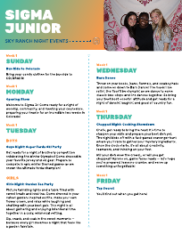 Week 1 MONDAY Opening Show Welcome to Sigma Jr! Come ready for a night of worship, community, and meeting your counselors, preparing your hearts for an incredible two weeks in Colorado!