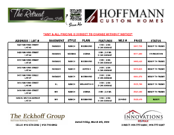 PREMIER SUBDIVISION - BRAND NEW HOMES! $250/Annually - Management, No Amenities Homes starting in the High $400K's, Low $500K's Conveniently Located at 152 Highway and Green Hills Road EASY ACCESS TO HIGHWAYS AND CONVENIENCE TO SHOPPING CENTERS For simulated photos and virtual tours of each floor plan, visit: www.TheEckhoffGroup.com