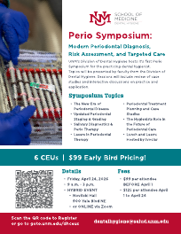 UNM's Division of Dental Hygiene hosts it's first Perio Symposium for the practicing dental hygienist. Topics will be presented by faculty from the Division of Dental Hygiene. Sessions will include review of case studies and interactive discussions on practice and application.
