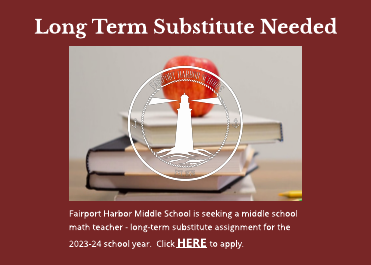 Fairport Harbor Middle School is seeking a middle school math teacher - long-term substitute assignment for the 2023-24 school year. Click HERE to apply.