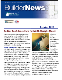 In another sign that the slowdown in the housing market continues, builder senti- ment fell for the ninth straight month in September as the combination of elevated interest rates, persistent supply chain disruptions and high home prices continue to take a toll on affordability. Builder confidence in the market for newly built single-family homes fell three points in September to 46, the lowest level since May 2014 with the exception of the spring of 2020, according to the NAHB/Wells Fargo Housing Market Index (HMI). The HMI is projecting ongoing decline for the volume of single-family housing starts. In another indicator of a weakening market, 24% of builders reported reducing home prices, up from 19% last month. Due to tightening monetary policy, mortgage rates increased above 6% last week, the highest level since 2008, which is pricing buyers out of the market. More than half of the build- bers in our survey reported using incentives to bolster sales, including mortgage rate buydowns, free amenities and price reductions. Derived from a monthly survey that NAHB has been conducting for more than 35 years, the NAHB/Wells Fargo HMI gauges builder perceptions of current single-family home sales and sales expectations for the next six months as “good,” “fair” or “poor.” The survey also asks builders to rate traffic of prospective buyers as “high to very high,” “average” or “low to very low.” Scores for each component are then used to calculate a seasonally adjusted index where any number over 50 indicates that more builders view conditions as good than poor.