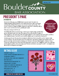 THE BCBA NEWSLETTER IS A MONTHLY ELECTRONIC PUBLICATION BY THE BOULDER COUNTY BAR ASSOCIATION. ARTICLES BY GUEST LAWYERS MAY NOT BE REPRODUCED WITHOUT PERMISSION FROM THE BOULDER COUNTY BAR ASSOCIATION OR THE AUTHORS. COMMERCIAL ADVERTISING INFORMATION IS AVAILABLE BY CONTACTING bay@boulder-bar.org OR THE BAR'S WEBSITE www.boulder-bar.org