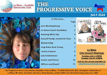 The Progressive Voice is the monthly newsletter of the La Mesa - Foothills Democratic Club, serving the communities of La Mesa, Mt. Helix, San Carlos, Del Cerro, Allied Gardens, and the SDSU and other East County areas since 1984.