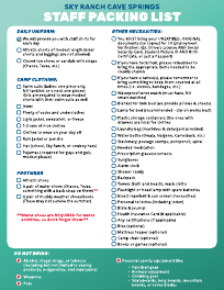 Water bottle (Owala, Nalgene, Camelback, etc.) Stationary, postage stamps, pen/pencil, spiral Needed medication Prescription glasses/contacts Sunglasses Alarm clock Shower caddy Backpack Towels (bath and beach), wash cloths Flashlight or head lamp with spare batteries Insect repellent & sun screen (necessities) Personal toiletries (including lotion) Bible & journal Health Insurance Card (if applicable) Any certifications (if applicable) Bike (optional) Mattress topper (optional) Camp chair (optional) Books or games (optional)