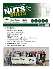 Attention: OSHA NEWS Letter from the President SDHBA Members in DC DC Travel Reports NAHB Local Advocacy Efforts across the Nation Executive Vice President Report Meet Your 2022 Executive Leadership Team NAHB Monthly News Updates State Membership PAY$ Off