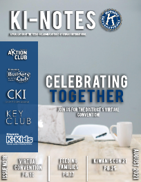 ello Fellow Kiwanians! Are you excited for the virtual convention? I sure am! We are in for a treat as we get to hear from special guests as well as our very own leadership team. I know many had their hearts set for an in person convention, but I assure you this virtual one will still be a treat. This is the last KI Notes before the new Kiwanis year. I would like to encourage you to take some time to reminisce about your time as a Kiwanian this year. Like last year we continued to face many challenges, but like every year we put in the work to come on top.