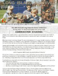 The 30th Annual Long Island Archives Conference Monday, March 16, 2026 at Farmingdale State College, SUNY EMBRACING CHANGE Change is here, and the annual Long Island Archives Conference has permanently moved to the month of March! As this conference turns thirty, we look back on how far we've come, and forward to the journey ahead. What does it mean to embrace change? Do we actively embrace it? Is it scary, met with resistance, or flat-out rejected by ourselves, our colleagues, or the organizations we work for? Perhaps it is an overload of change; too much too fast, that has us concerned. Perhaps you are ready for change and eager to see what’s ahead. Change may be inevitable: we research the archives to flesh out a long held narrative, follow the evidence to find untold stories and new perspectives, or revisit past goals and missions to forge a new direction. It may mean using technology to forge into a new tomorrow, or creating unlikely partnerships that broaden your outreach in unexpected ways. We want to hear all about it! Call for Presenters: 2026 Annual Long Island Archives Conference This year the conference is looking for speakers to tell us about their archival materials and how they have been using a new approach, a new technology, or assigning new duties to embrace the change we want to see. Embracing a change that allows more interest and exposure to our timeless Long Island history. Presentations are scheduled for 45 minutes followed by 10 minutes of Q&A. We are interested in topics that may include but not limited to: How create new meaning to stories we have us relied on for decades Has your site used AR or VR successfully and what were the pros and cons Was there a recent change in staff, mission, location that impacted the organization and the archives? If you are interested in presenting or would like to discuss it further, please email Nicole Menchise at nmenchise@lilrc.org. We hope to see you there. One ticket price for all - open to non-members! Students receive special pricing with proof of current enrollment. 3.5 CEUs will be offered. Register at LILRC.org/events or go directly to: https://lilrc.org/events/EventDetails.aspx?id=2009677&group=