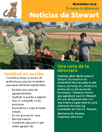 Familias, ¡Qué rápido pasa el tiempo! ¡Ya estamos en noviembre! Nos encanta el aire fresco, las hojas de colores y el aroma de los dulces recién horneados. Tenemos mucho que agradecer aquí en Stewart. Así que abríguense bien con una manta y sigan leyendo para enterarse de todas las novedades en Grace E. Stewart. Atentamente, Deanna Carpenter, Directora