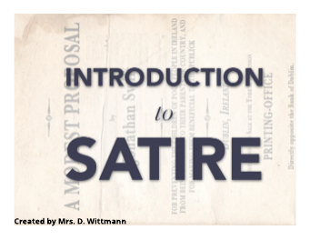 Satire always has a target Often Used Devices: diction, hyperbole, capitalization, alliteration, repetition, verbal irony, diction, incongruent details, understatement, malapropism, oxymoron, irony Analyzing Satire: Target: ie. government Devices: ie. parody, repetition Type (tone): Horatian or Juvenalian Placement: on the continuum Articulation: give your rational – explain your placement