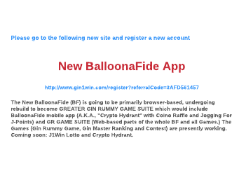 Please go to the following new site and register a new account New BalloonaFide App http://www.gin1win.com/register?referralCode=3AFD561457 The New BalloonaFide (BF) is going to be primarily browser-based, undergoing rebuild to become GREATER GIN RUMMY GAME SUITE which would include BalloonaFide mobile app (A.K.A., "Crypto Hydrant" with Coino Raffle and Jogging For J-Points) and GR GAME SUITE (Web-based parts of the whole BF and all Games.) The Games (Gin Rummy Game, Gin Master Ranking and Contest) are presently working. Coming soon: J1Win Lotto and Crypto Hydrant.