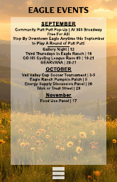 AUGUST Cowboys Forever Foundation Rodeo Series | 1 & 8 Tube-A-Palooza | 3 Yoga In The Park | 3, 17 & 31 ShowDown Town | Winyah | 7 Yoga By The River | 10 & 24 ShowDown Town | Boogie Machine | 14 Third Thursdays In Eagle Ranch | 21 2025 Community Table | 24 September Eagle Chamber's Biztoberfest | 4 CO HS Cycle League Race #2 | 5-7 Eagle River Cleanup | 6 Gallery Night | 12 Third Thursdays In Eagle Ranch | 18 CO HS Cycling League Race #3 | 19-21 Eagle Ranch Pumpkin Patch | 28 OCTOBER Vail Valley Cup Soccer Tournament | 3-5 Eagle Ranch Pumpkin Patch | 5 Energy Supply Discussion Panel | 20 Trick or Treat Street | 29 November Food Use Panel | 17