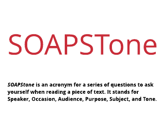 SOAPSTone SOAPStone is an acronym for a series of questions to ask yourself when reading a piece of text. It stands for Speaker, Occasion, Audience, Purpose, Subject, and Tone.
