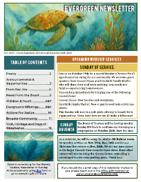 . Poetry ..................................................2 Announcements & Opportunities ..................................3 From Rev. Joe ................................4 News From the Board ...............5 Children & Youth .....................6&7 Evergreen's Offerings...........8&9 Actions For Justice ................... 10 Broader Community ................ 11 UUA, Holidays and Days of Observance .................................... 12