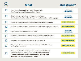 Email summer prep info to your summer manager - Required info is listed in the Contact Us section on the staff info page