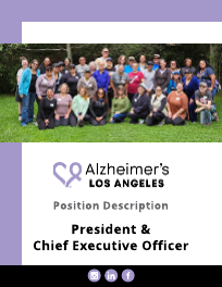 The President & Chief Executive Officer (CEO) is the chief visionary, fundraiser, and ambassador of Alzheimer’s Los Angeles. The President & CEO will lead the organization into its next phase of growth by strengthening philanthropic support, elevating public visibility, and building lasting partnerships with funders, healthcare systems, policymakers, and community stakeholders. With the support of a strong and engaged Board of Directors, the President & CEO will ensure the organization continues to deliver compassionate, high-quality programs while expanding its reach and long-term impact. Reporting to the Board, the President and CEO leads a dedicated staff of approximately 50 through the following direct reports: Chief of Staff, Chief Philanthropy Officer, Vice President, Programs & Health Equity, Associate Vice President, Public Policy, Chief Operating Officer, and Vice President, Healthcare Services & Professional Training.